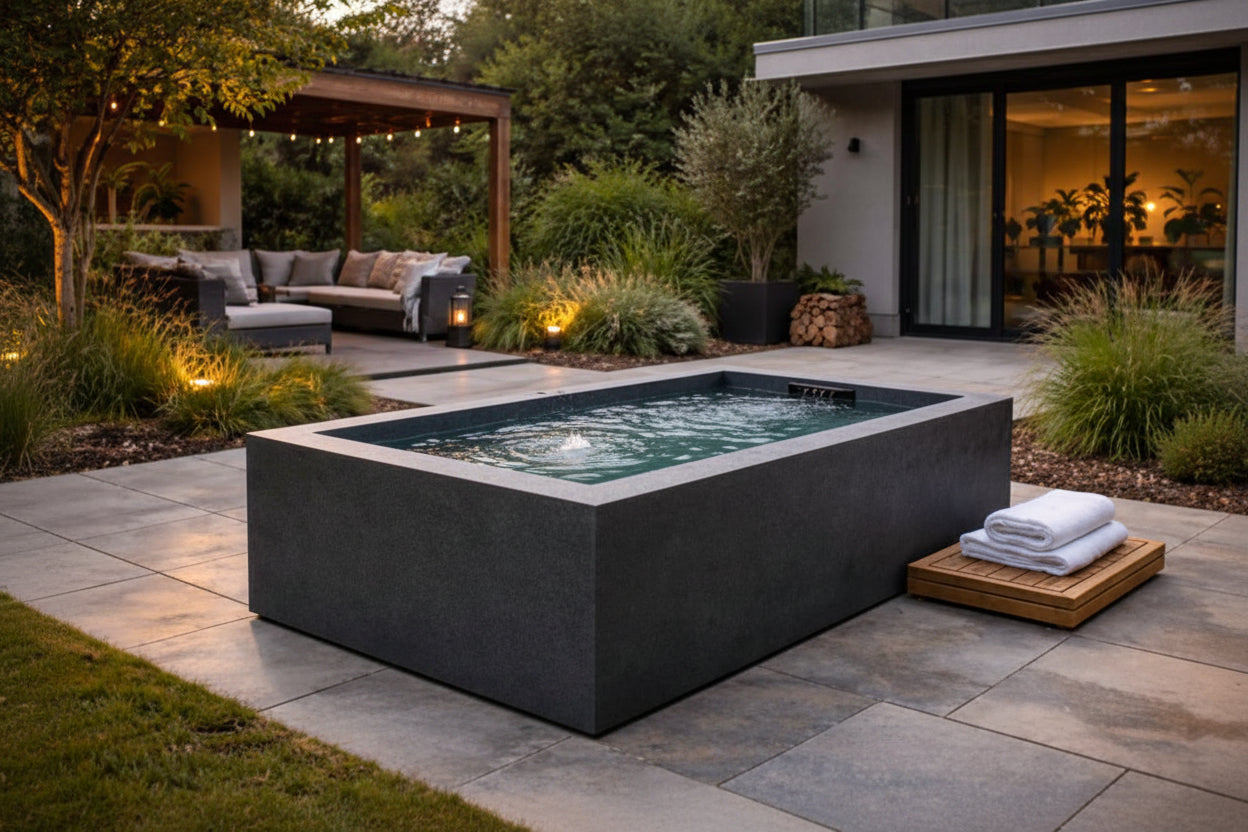 Unlike temporary or inflatable options, this cold plunge is intended to live outdoors year-round as a functional extension of a modern wellness space.